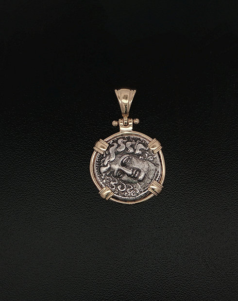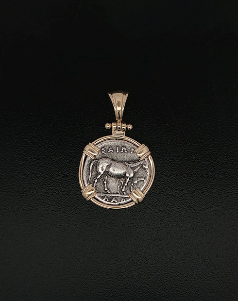 This silver Greek Drachm features the Nymph head of Larissa with a horse grazing right. This Ancient Greek coin was minted in Thessaly, Greek city-states 350 – 325 B.C. This coin is hand-set in a 14kt gold pendant.
