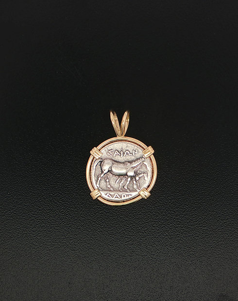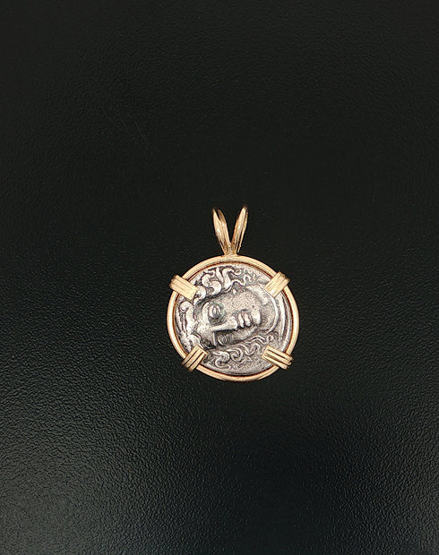 This Greek drachm was minted in Greek city states, Thessaly dated 350 – 323 B.C. This coin features the head of nymph Larissa with a horse grazing right. This silver drachm is handset in a 14kt gold pendant.