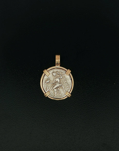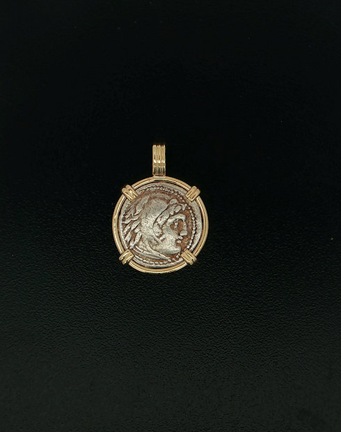 This silver Greek Drachm features Alexander the Great with Zeus seated holding an Eagle. This Ancient Greek coin was minted in the Greek city-states 336-323 B.C. This coin is hand-set in a 14kt gold pendant.