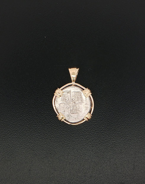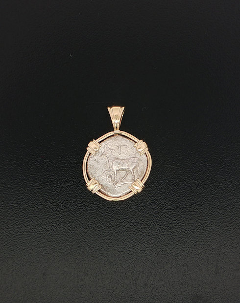 This silver Greek Drachm features a cow standing over dolphin with incuse square. This Ancient Greek coin was minted in Thrace, Greek city-states 386 – 340 B.C. This coin is hand-set in a 14kt gold pendant.