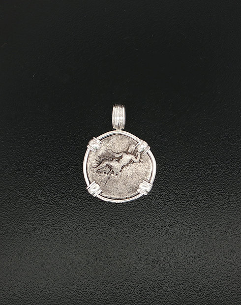 This silver Greek Drachm feature The head of Herakles with Zeus seated holding an Eagle. This Ancient Greek coin was minted in the Greek city-states 336-323 B.C. This coin is hand-set in a Sterling silver pendant.