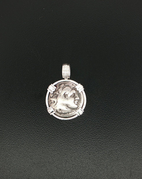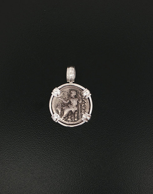 This silver Greek Drachm feature The head of Herakles with Zeus seated holding an Eagle. This Ancient Greek coin was minted in the Greek city-states 336-323 B.C. This coin is hand-set in a Sterling silver pendant.