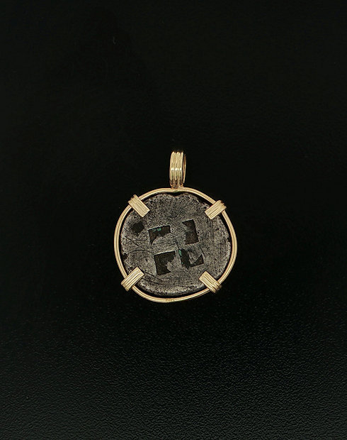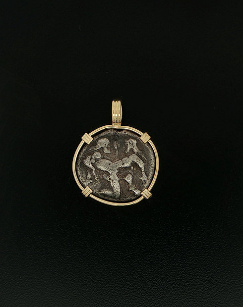 This silver Greek Stater features the Incuse Square Design with a satyr ravishing nymph. This Ancient Greek coin was minted in the Greek city states 550 – 463 B.C. This coin is hand set in a 14kt gold pendant.