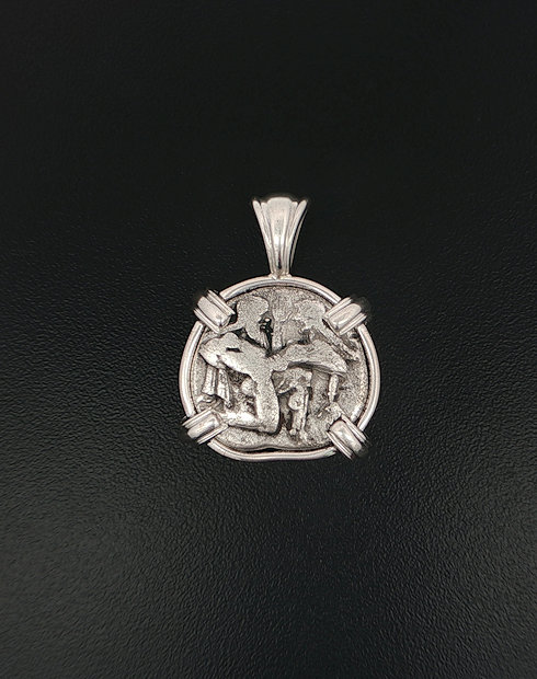 This silver Greek Stater features the Incuse Square Design with a satyr ravishing nymph. This Ancient Greek coin was minted in the Greek city states 550 – 463 B.C. This coin is hand set in a sterling silver pendant.
