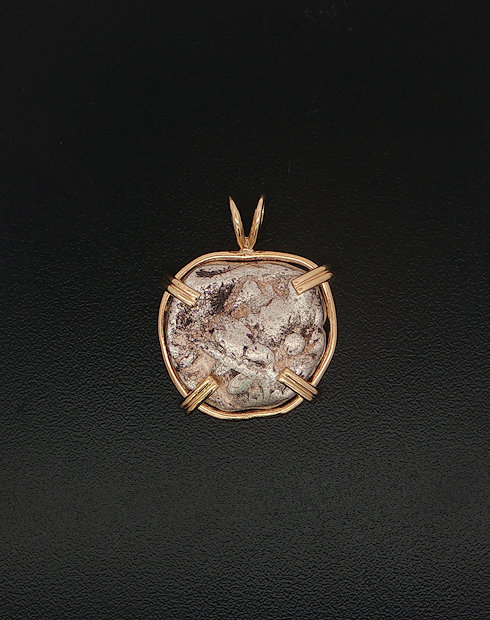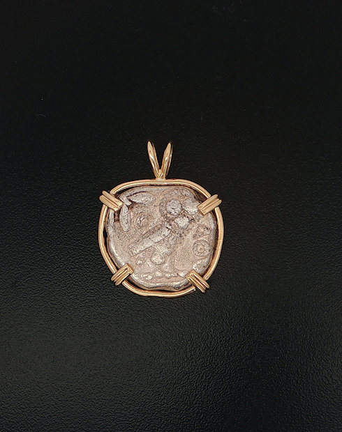 Athens became a dominant political and cultural hub, but after the Peloponnesian War (431–404 BCE), it lost much of its wealth and influence. Although it regained prosperity in the 4th century, Athens never fully recovered its former power and became reliant on Macedon and later Rome. The “New Style” coinage was introduced around 200 BCE and lasted for about 100 years. This coing was handset in a 14kt Gold Pendant.
