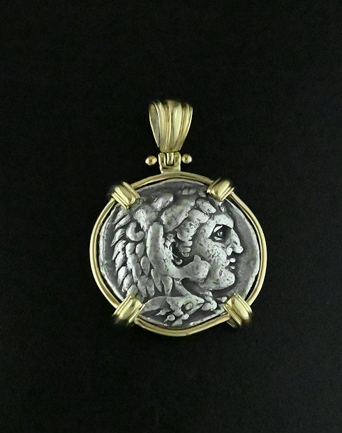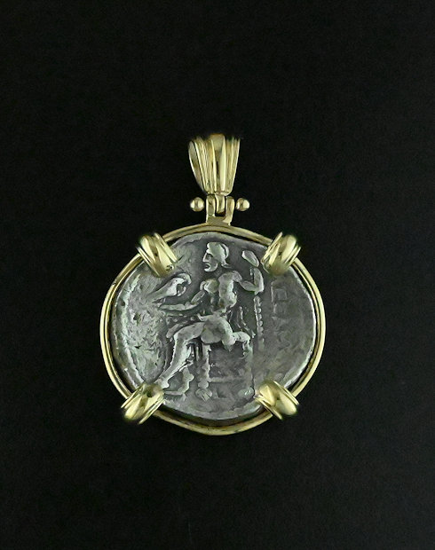 Athens became a dominant political and cultural hub, but after the Peloponnesian War (431–404 BCE), it lost much of its wealth and influence. Although it regained prosperity in the 4th century, Athens never fully recovered its former power and became reliant on Macedon and later Rome. The “New Style” coinage was introduced around 200 BCE and lasted for about 100 years. This coing was handset in a 14kt Gold Pendant.