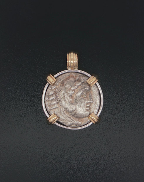 This silver Greek Tetradrachm feature The head of Herakles with Zeus seated holding an Eagle. This Ancient Greek coin was minted in the Greek city-states 336-323 B.C. This coin is hand-set in a 14kt gold pendant.