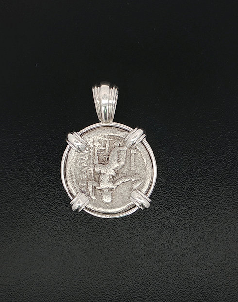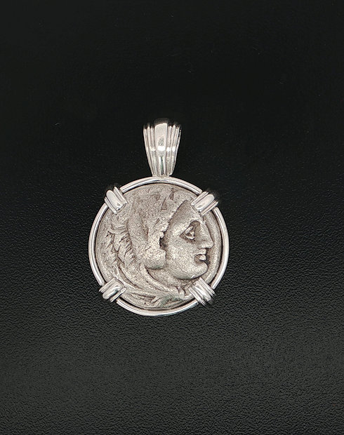 This silver Greek Tetradrachm feature The head of Herakles with Zeus seated holding an Eagle. This Ancient Greek coin was minted in the Greek city-states 336-323 B.C. This coin is hand-set in a Sterling silver pendant.