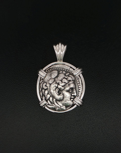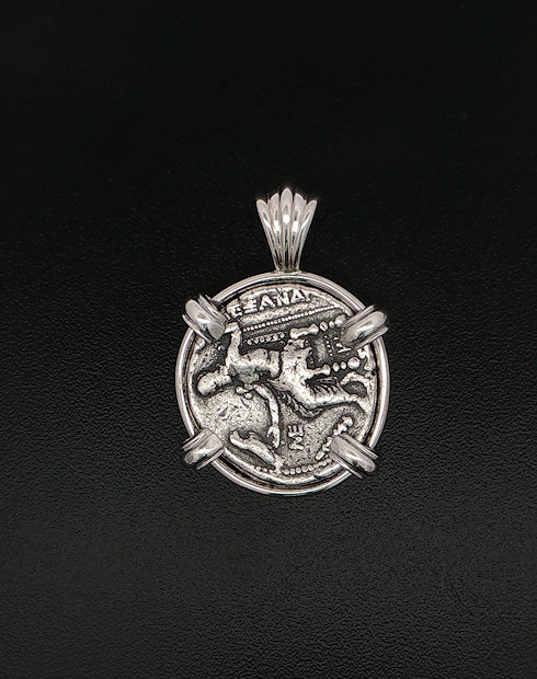 This silver Greek Drachm features The head of Herkales with Zeus seated holding an Eagle. This Ancient Greek coin was minted in the Greek city-states 336-323 B.C. This coin is hand-set in a sterling silver pendant.