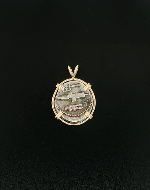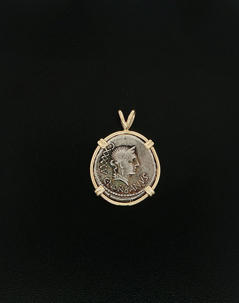 This Roman Republic coinage was minted in Rome, Dated 83 B.C. The moneyer Of this silver Denarius is C. Norbanus. This Roman denarius features the Head of Venus with the ear of corn. This coin was hand set in a 14kt gold pendant.