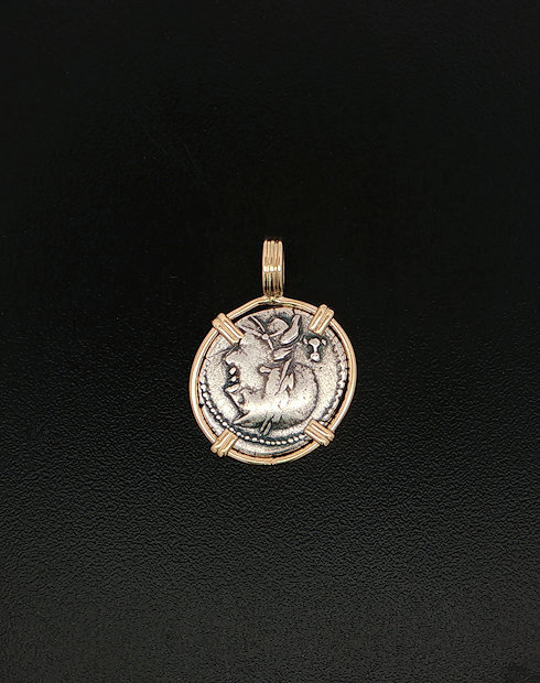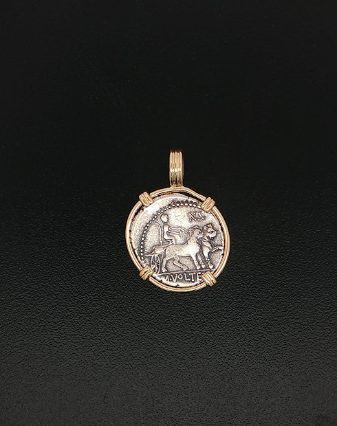 This Roman Denarius was minted in Rome, Italy dated 78 B.C. The Moneyer of this coin being Volteius, this Denarius features the bust of Attis with Kybele in biga. This silver roman coinage is handset in a 14kt gold pendant.