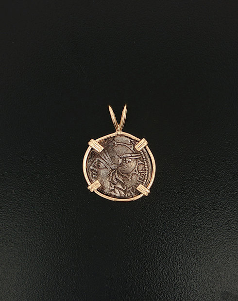 This Roman Denarius was minted in Rome, dated 37 B.C. The Moneyer of this coin being M. Baebitus, this Denarius features the bust of Roma and Apollo in Biga. This silver roman coinage is handset in a 14kt gold pendant.
