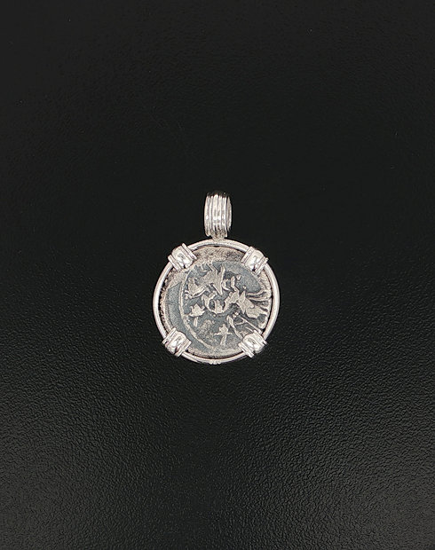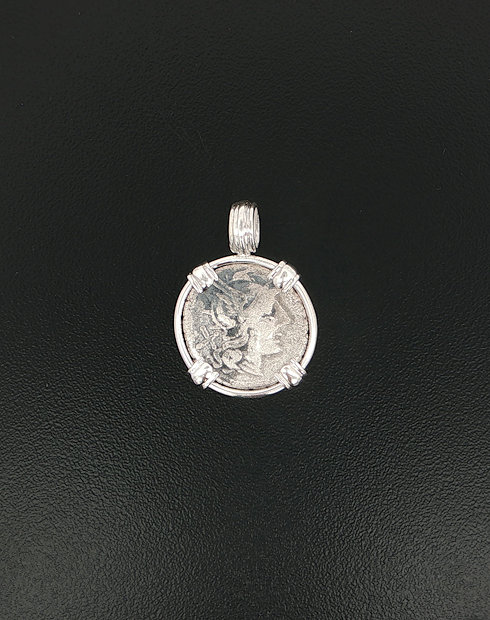 This Roman Republic Denarius was minted in Rome, The moneyer being the Dioscuri . This Roman coinage features the head of Roma wearing a winged helmet with discouri riding right. This coin was handset in a sterling silver pendant.