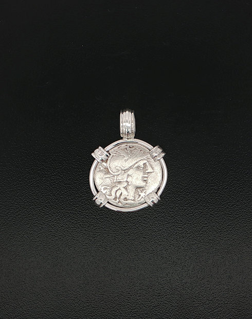 This Roman Republic Denarius was minted in Rome, Dated 136 B.C. The moneyer being L. Antestius Geagulus. This Roman coinage features the Bust of Jupitar in Quadriga. This coin was handset in a sterling silver pendant.