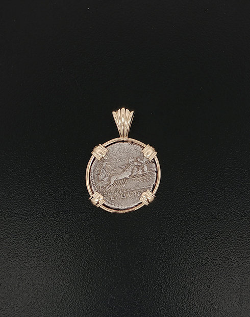 This Roman Republic Denarius was minted in Rome, The moneyer being the L. Julius Bursio. This Roman coinage features the head of Roma wearing a winged helmet with the victory in quadriga. This coin was handset in 14kt gold pendant.