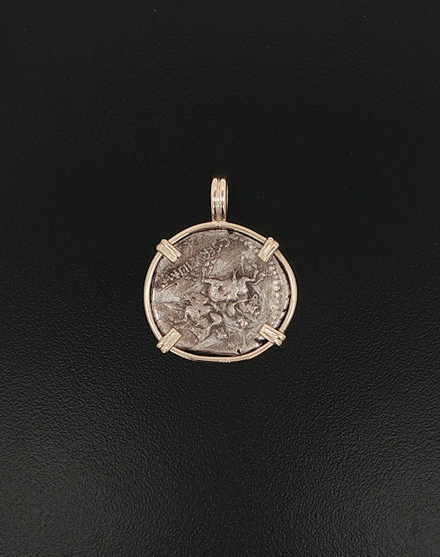 This Roman Republic Denarius was minted in Rome, The moneyer being C. Serveilius M.F Augar. This Roman coinage features the head of Roma wearing a winged helmet with the Discouri galloping. This coin was handset in a 14kt gold penadnt.