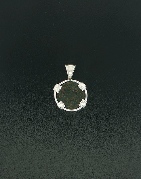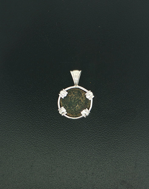This widows mite coin was minted Palestine, dated in 103-76. These coins are without doubt, were common coins used for daily commerce during the life of Christ, and as quoted from Mark 12: 41-44: “And Jesus sat over against the treasury and beheld how the people cast money into the treasury and many that were rich cast in much.  And there came a certain poor widow, and she threw in two mites, which makes a quadrans.  And he called unto his disciples and said to them: “Amen I say to you that this poor widow put in more than all those who have been putting in the treasury.  For they have put in abundance, but she out of her want has put in all that she had”. This coin was handset in a sterling silver pendant.