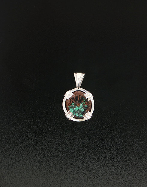 This widows mite coin was minted Palestine, dated in 103-76. These coins are without doubt, were common coins used for daily commerce during the life of Christ, and as quoted from Mark 12: 41-44: “And Jesus sat over against the treasury and beheld how the people cast money into the treasury and many that were rich cast in much.  And there came a certain poor widow, and she threw in two mites, which makes a quadrans.  And he called unto his disciples and said to them: “Amen I say to you that this poor widow put in more than all those who have been putting in the treasury.  For they have put in abundance, but she out of her want has put in all that she had”. This coin was handset in a sterling silver pendant.