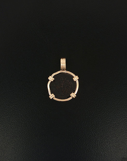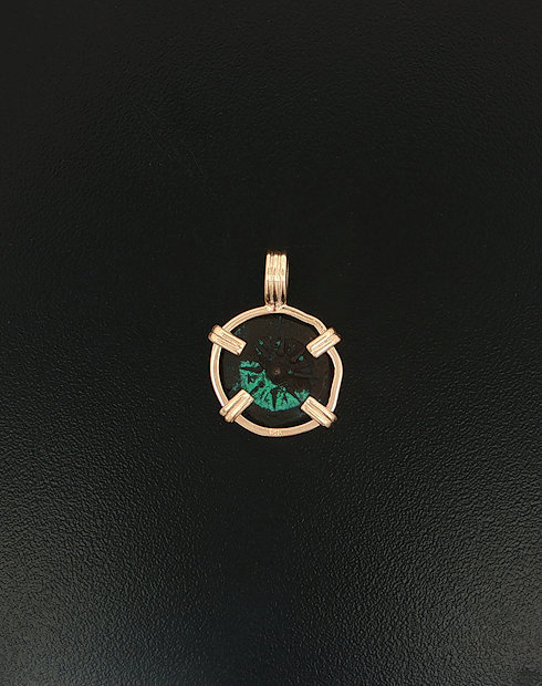 This widows mite coin was minted Palestine, dated in 103-76. These coins are without doubt, were common coins used for daily commerce during the life of Christ, and as quoted from Mark 12: 41-44: “And Jesus sat over against the treasury and beheld how the people cast money into the treasury and many that were rich cast in much.  And there came a certain poor widow, and she threw in two mites, which makes a quadrans.  And he called unto his disciples and said to them: “Amen I say to you that this poor widow put in more than all those who have been putting in the treasury.  For they have put in abundance, but she out of her want has put in all that she had”. This coin was handset in a 14kt gold pendent.