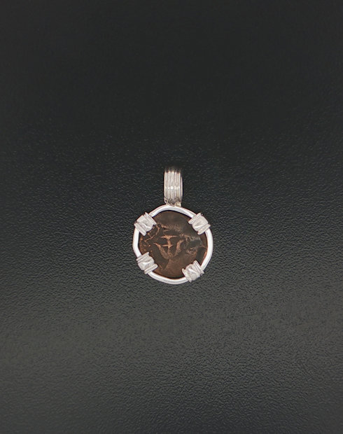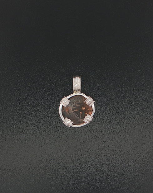 This widows mite coin was minted Palestine, dated in 103-76. These coins are without doubt, were common coins used for daily commerce during the life of Christ, and as quoted from Mark 12: 41-44: “And Jesus sat over against the treasury and beheld how the people cast money into the treasury and many that were rich cast in much.  And there came a certain poor widow, and she threw in two mites, which makes a quadrans.  And he called unto his disciples and said to them: “Amen I say to you that this poor widow put in more than all those who have been putting in the treasury.  For they have put in abundance, but she out of her want has put in all that she had”. This coin was handset in a sterling silver pendant.