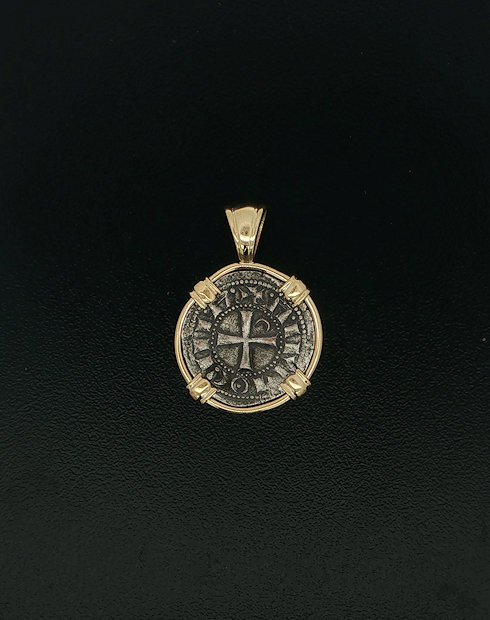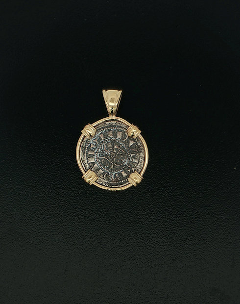 This coin was minted in Antioch which became the base for the Apostle Paul’s missionary journeys, where Jesus’ followers were first called Christians (Acts 11:26) and where the Gospel of Matthew was probably written. The city and its massive walls also played an important role during the Crusades. Featured on the reverse of the silver denier is a cross (the cross of Jerusalem, the Crusader’s cross or the Maltese cross). The Maltese cross is a symbol of the Christian warrior, of protection, a badge of honor. The eight points on the Maltese cross symbolize the chivalric virtues: Loyalty; Piety; Frankness; Braveness; Glory and Honor; Contempt of Death; Helpfulness towards the Poor and the Sick; and Respect for the Church. Firefighters use the symbol today as their badge of honor and bravery. This coin was minted under the rule of Bohemond III, portrait on obverse around 1163 to 1265 and hand-framed in a 14kt gold pendant.