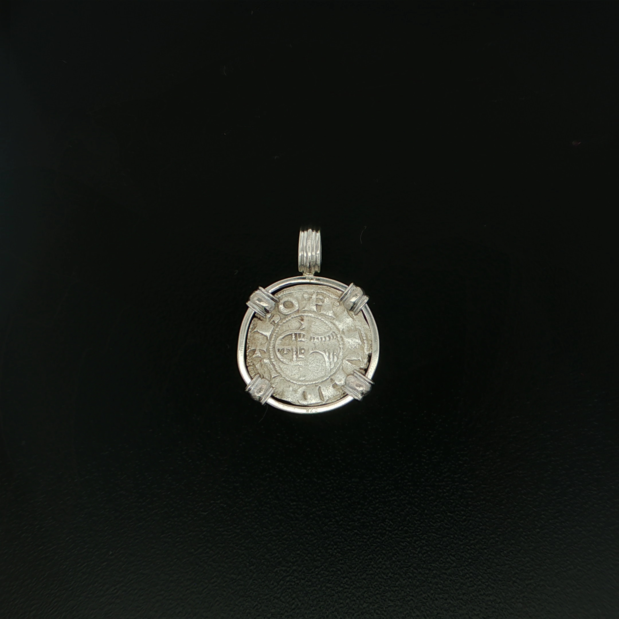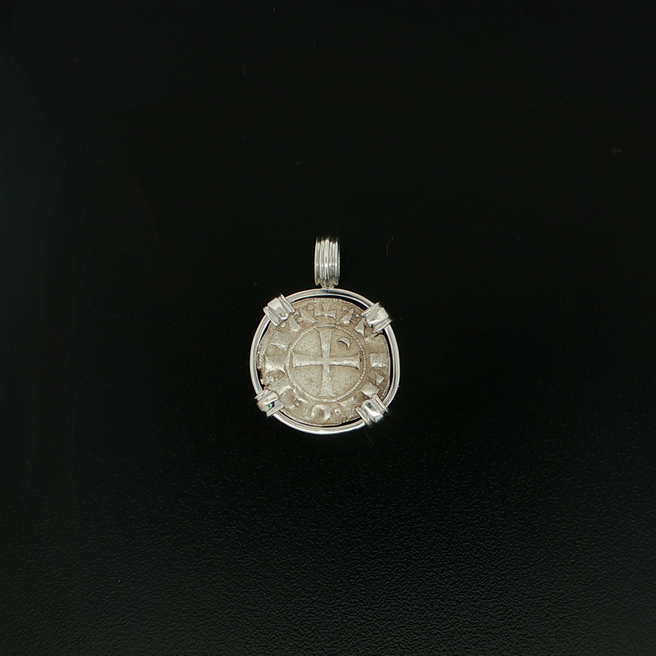 This coin was minted in Antioch which became the base for the Apostle Paul’s missionary journeys, where Jesus’ followers were first called Christians (Acts 11:26) and where the Gospel of Matthew was probably written. The city and its massive walls also played an important role during the Crusades. Featured on the reverse of the silver denier is a cross (the cross of Jerusalem, the Crusader’s cross or the Maltese cross). The Maltese cross is a symbol of the Christian warrior, of protection, a badge of honor. The eight points on the Maltese cross symbolize the chivalric virtues: Loyalty; Piety; Frankness; Braveness; Glory and Honor; Contempt of Death; Helpfulness towards the Poor and the Sick; and Respect for the Church. Firefighters use the symbol today as their badge of honor and bravery. This coin was minted under the rule of Bohemond III, portrait on obverse around 1163 to 1201 and hand-framed in a sterling silver pendant.