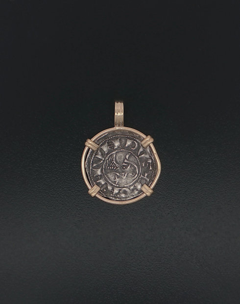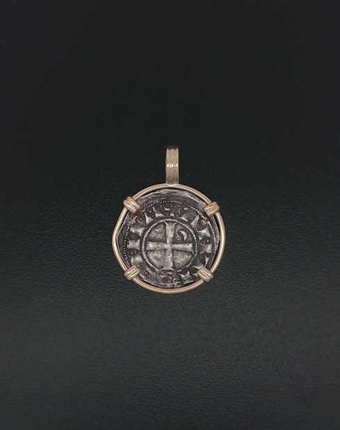 This coin was minted in Antioch which became the base for the Apostle Paul’s missionary journeys, where Jesus’ followers were first called Christians (Acts 11:26) and where the Gospel of Matthew was probably written. The city and its massive walls also played an important role during the Crusades. Featured on the reverse of the silver denier is a cross (the cross of Jerusalem, the Crusader’s cross or the Maltese cross). The Maltese cross is a symbol of the Christian warrior, of protection, a badge of honor. The eight points on the Maltese cross symbolize the chivalric virtues: Loyalty; Piety; Frankness; Braveness; Glory and Honor; Contempt of Death; Helpfulness towards the Poor and the Sick; and Respect for the Church. Firefighters use the symbol today as their badge of honor and bravery. This coin was minted under the rule of Bohemond III, portrait on obverse around 1163 to 1201 and hand-framed in a 14kt gold pendant.
