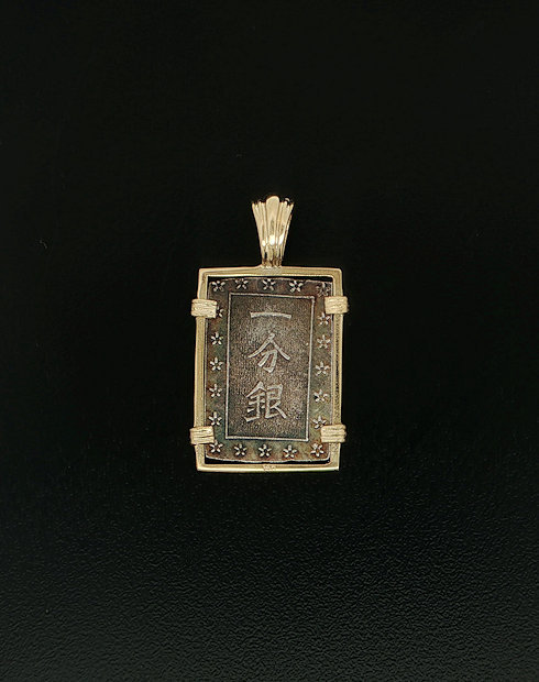 This Japanese rectangular Ichibu gin silver coin was minted under Emperor Komei sometime between 1837 and 1868 Each rectangular coin can be identified to the reign of a specific ruler, although the date in most instances can only be determined by the period of the Emperor’s rule. This marked the end of the Shogun era and the dawning of the modern age. This artifact represents some of the rare rectangular coins minted in history and is hand framed in a 14kt gold pendent.