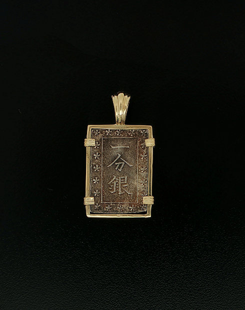 This Japanese rectangular Ichibu gin silver coin was minted under Emperor Komei sometime between 1837 and 1868 Each rectangular coin can be identified to the reign of a specific ruler, although the date in most instances can only be determined by the period of the Emperor’s rule. This marked the end of the Shogun era and the dawning of the modern age. This artifact represents some of the rare rectangular coins minted in history and is hand framed in a 14kt gold pendent.