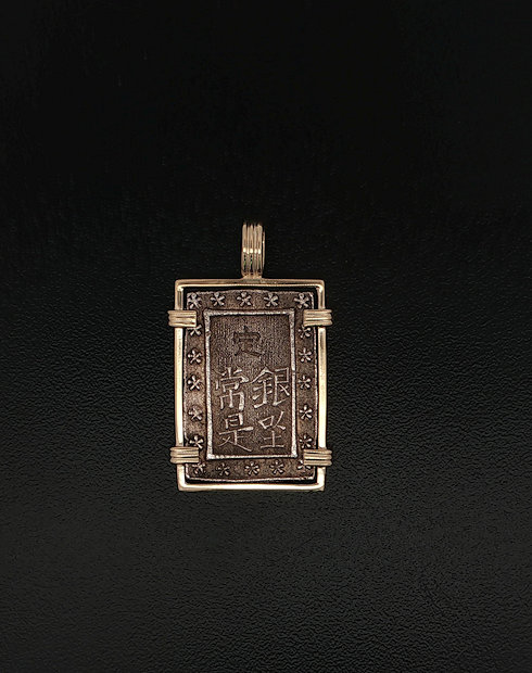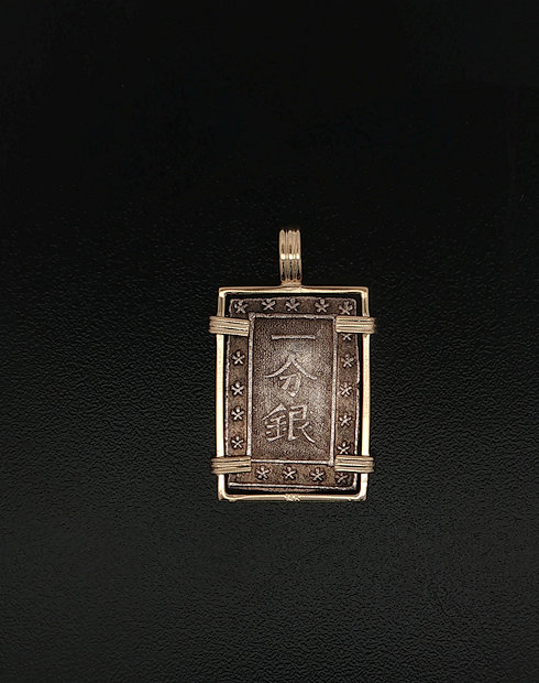 This Japanese rectangular Ichibu gin silver coin was minted under Emperor Komei sometime between 1837 and 1868 Each rectangular coin can be identified to the reign of a specific ruler, although the date in most instances can only be determined by the period of the Emperor’s rule. This marked the end of the Shogun era and the dawning of the modern age. This artifact represents some of the rare rectangular coins minted in history and is hand framed in a 14kt gold pendent.