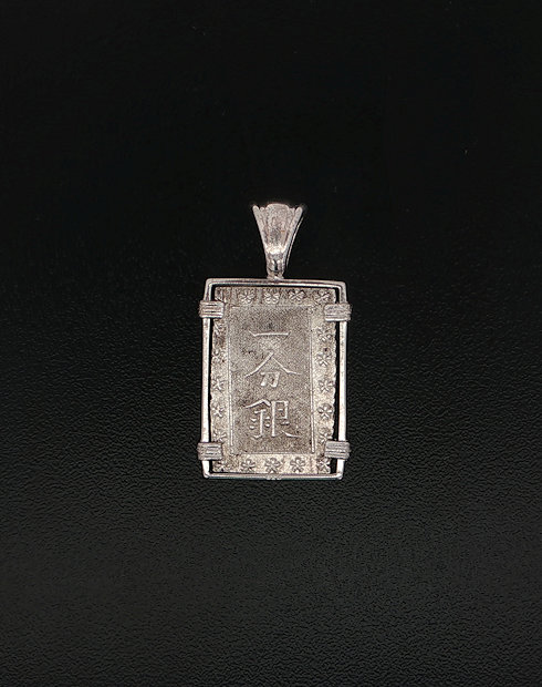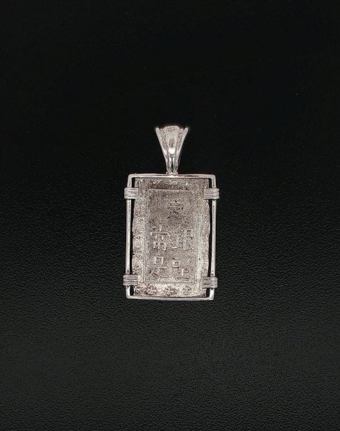 This Japanese rectangular Ichibu hu gin silver coin was minted under Emperor Komei sometime between 1846 and 1867 Each rectangular coin can be identified to the reign of a specific ruler, although the date in most instances can only be determined by the period of the Emperor’s rule. This marked the end of the Shogun era and the dawning of the modern age. This artifact represents some of the rare rectangular coins minted in history and is hand framed in a sterling silver pendent.