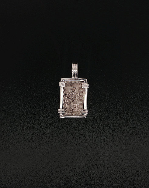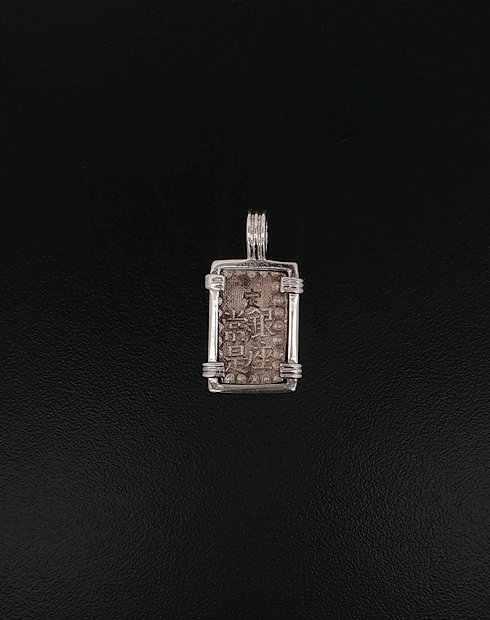 This Japanese rectangular isshu gin silver coin was minted under Emperor Komei sometime between 1847 and 1866 Each rectangular coin can be identified to the reign of a specific ruler, although the date in most instances can only be determined by the period of the Emperor’s rule. This marked the end of the Shogun era and the dawning of the modern age. This artifact represents some of the rare rectangular coins minted in history and is hand framed in a sterling silver pendent.