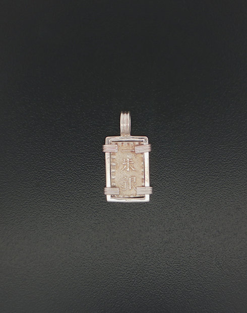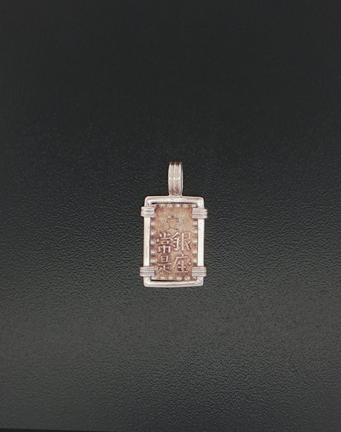 This Japanese rectangular isshu gin silver coin was minted under Emperor Komei sometime between 1867 and 1912 Each rectangular coin can be identified to the reign of a specific ruler, although the date in most instances can only be determined by the period of the Emperor’s rule. This marked the end of the Shogun era and the dawning of the modern age. This artifact represents some of the rare rectangular coins minted in history and is hand framed in a sterling silver pendent.