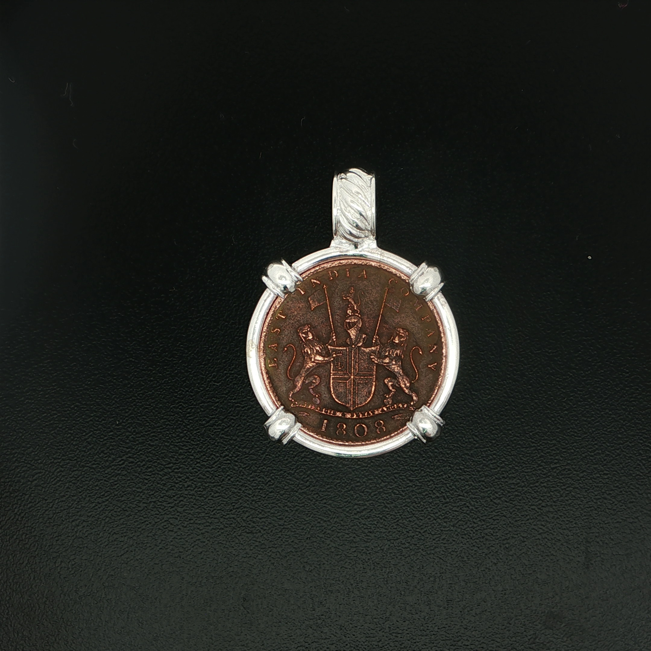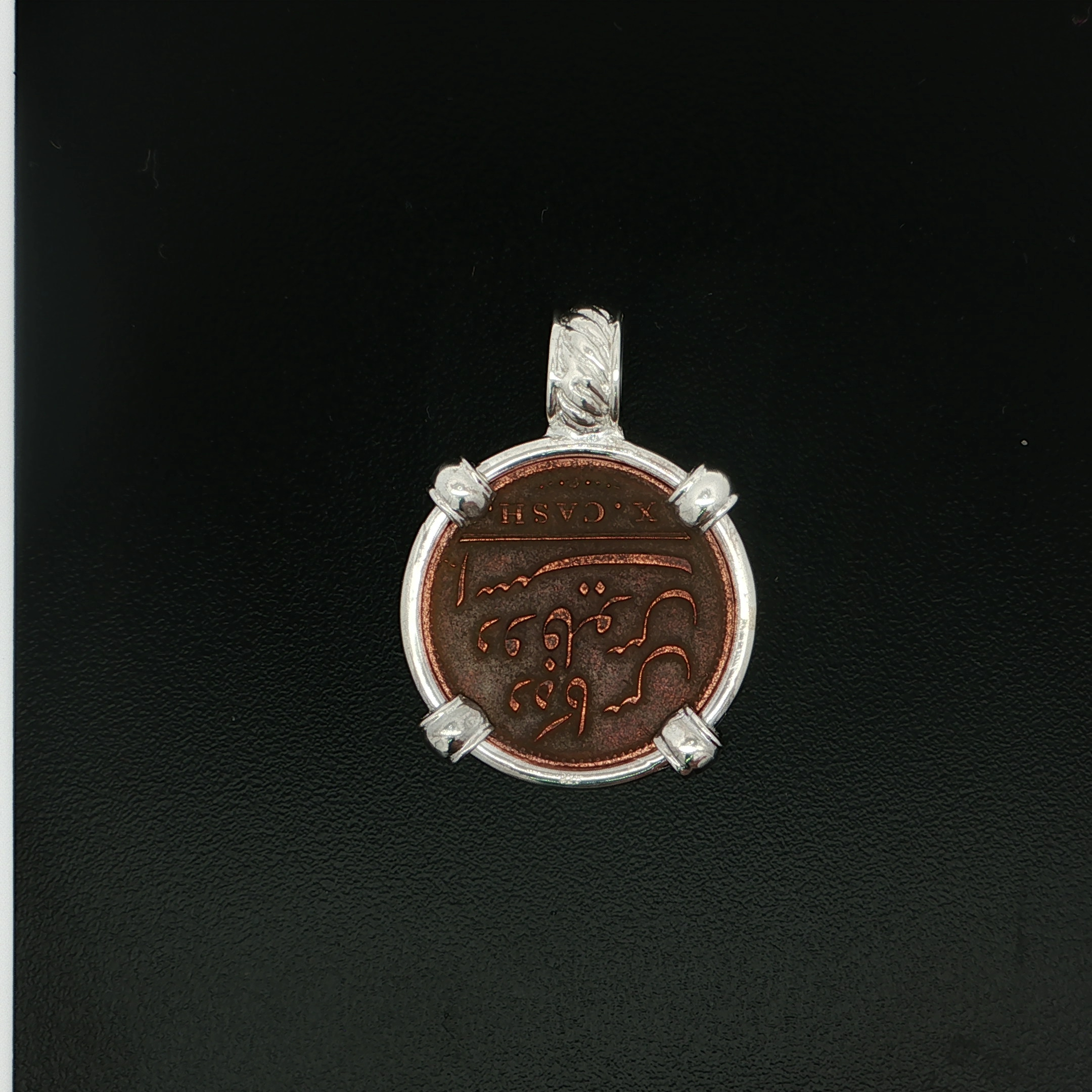During the 18th and 19th centuries, for trading purposes, the famous English East India Company sent a fleet of well-equipped flagships to India and China once a year. 1809 was the unlucky year for the Admiral Gardner and her sister-ship Britannia. The 145-foot, 813-ton vessel Admiral Gardner was outbound with a valuable cargo of approximately 50 tons of specially minted copper coinage, destined for the East Indian Company’s Mint at Madras. As the Admiral Gardner left the safety of the River Thames and proceeded beyond the Straits of Dover, a very sudden storm developed in the English Channel the dark night of January 25th and subsequently swept her on to the deadly “Goodwin Sands” sandbar. This copper artifact is hand-set in a sterling silver pendant.