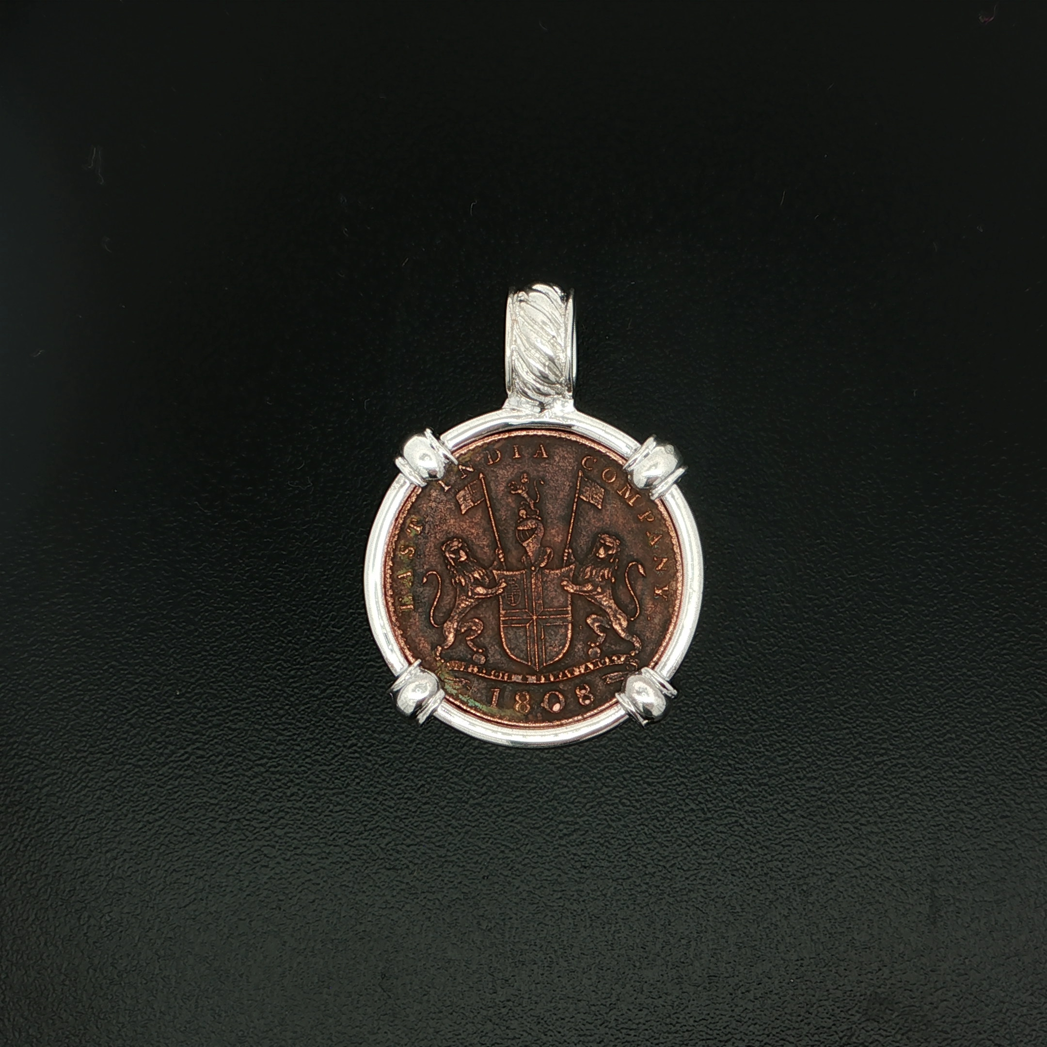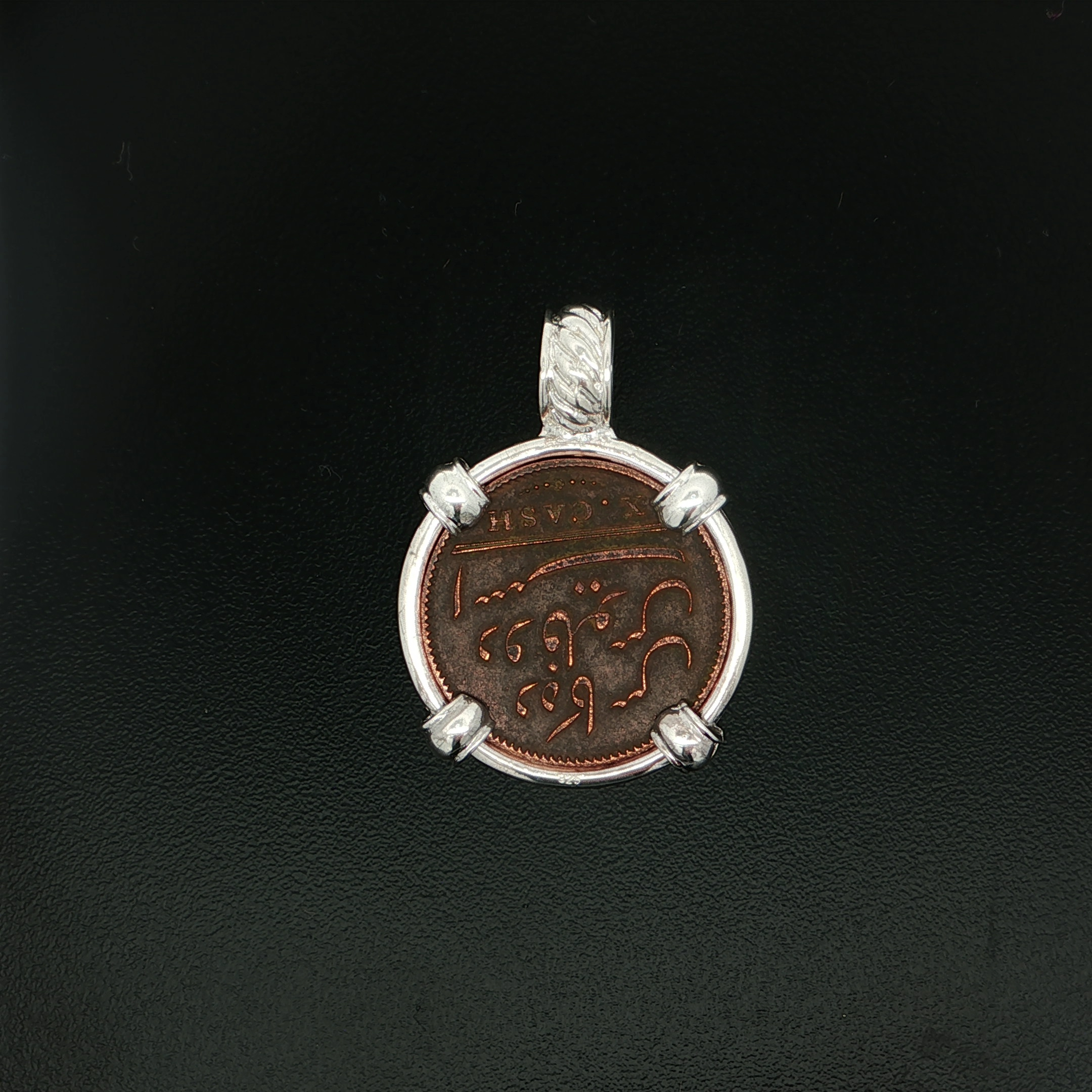 During the 18th and 19th centuries, for trading purposes, the famous English East India Company sent a fleet of well-equipped flagships to India and China once a year. 1809 was the unlucky year for the Admiral Gardner and her sister-ship Britannia. The 145-foot, 813-ton vessel Admiral Gardner was outbound with a valuable cargo of approximately 50 tons of specially minted copper coinage, destined for the East Indian Company’s Mint at Madras. As the Admiral Gardner left the safety of the River Thames and proceeded beyond the Straits of Dover, a very sudden storm developed in the English Channel the dark night of January 25th and subsequently swept her on to the deadly “Goodwin Sands” sandbar. This copper artifact is hand-set in a sterling silver pendant.