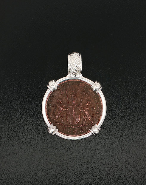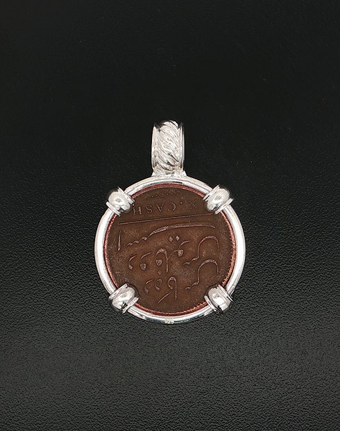During the 18th and 19th centuries, for trading purposes, the famous English East India Company sent a fleet of well-equipped flagships to India and China once a year. 1808 was the unlucky year for the Admiral Gardner and her sister-ship Britannia. The 145-foot, 813-ton vessel Admiral Gardner was outbound with a valuable cargo of approximately 50 tons of specially minted copper coinage, destined for the East Indian Company’s Mint at Madras. As the Admiral Gardner left the safety of the River Thames and proceeded beyond the Straits of Dover, a very sudden storm developed in the English Channel the dark night of January 25th and subsequently swept her on to the deadly “Goodwin Sands” sandbar. This copper artifact is hand-set in a sterling silver pendant.