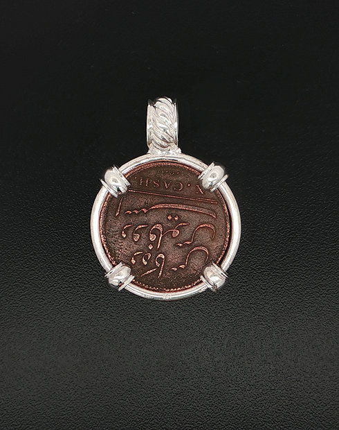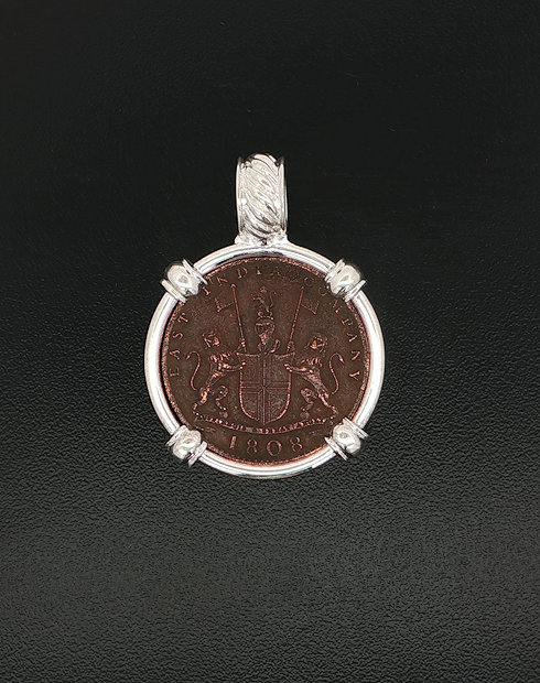 During the 18th and 19th centuries, for trading purposes, the famous English East India Company sent a fleet of well-equipped flagships to India and China once a year. 1808 was the unlucky year for the Admiral Gardner and her sister-ship Britannia. The 145-foot, 813-ton vessel Admiral Gardner was outbound with a valuable cargo of approximately 50 tons of specially minted copper coinage, destined for the East Indian Company’s Mint at Madras. As the Admiral Gardner left the safety of the River Thames and proceeded beyond the Straits of Dover, a very sudden storm developed in the English Channel the dark night of January 25th and subsequently swept her on to the deadly “Goodwin Sands” sandbar. This copper artifact is hand-set in a sterling silver pendant.