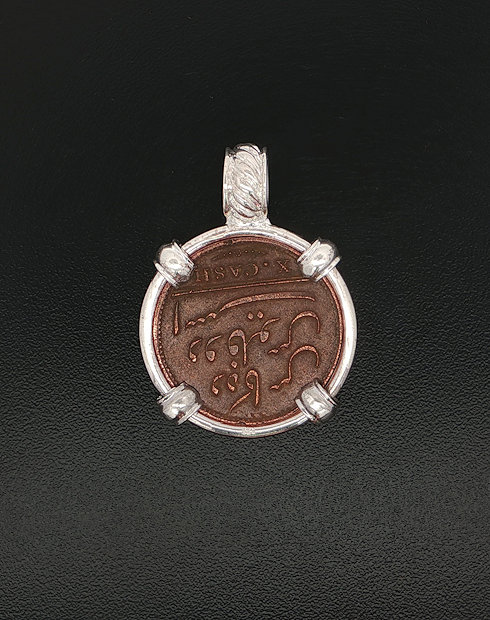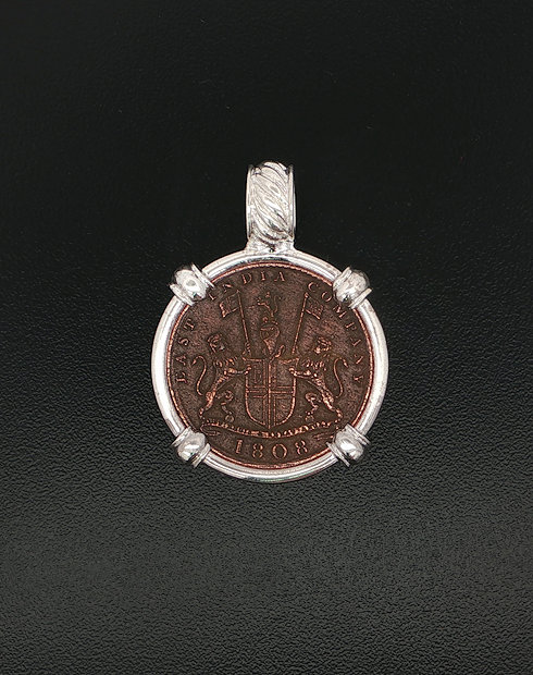During the 18th and 19th centuries, for trading purposes, the famous English East India Company sent a fleet of well-equipped flagships to India and China once a year. 1808 was the unlucky year for the Admiral Gardner and her sister-ship Britannia. The 145-foot, 813-ton vessel Admiral Gardner was outbound with a valuable cargo of approximately 50 tons of specially minted copper coinage, destined for the East Indian Company’s Mint at Madras. As the Admiral Gardner left the safety of the River Thames and proceeded beyond the Straits of Dover, a very sudden storm developed in the English Channel the dark night of January 25th and subsequently swept her on to the deadly “Goodwin Sands” sandbar. This copper artifact is hand-set in a sterling silver pendant.