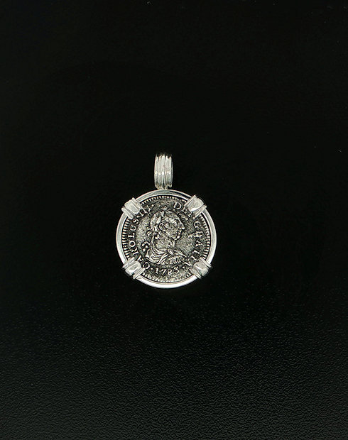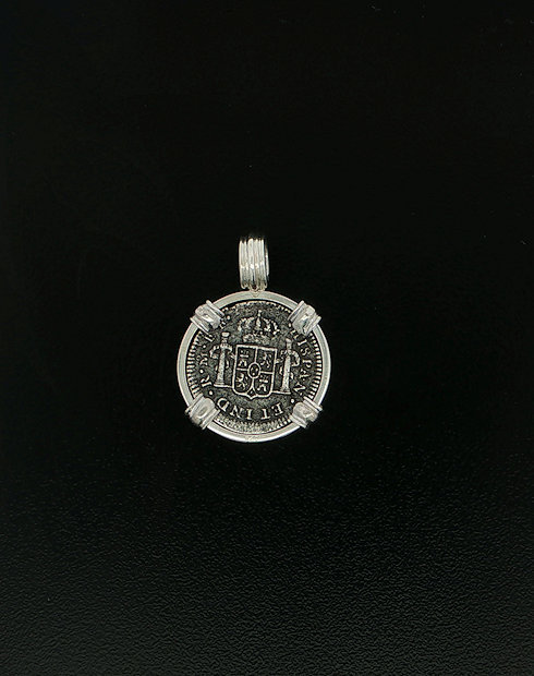 In 1783, the ill-fated ship, El Cazador, The Hunter was headed toward New Orleans from Vera Cruz, Mexico. The ship was laden with 450,000 pesos, which were intended to solidify Spain’s holdings of approximately one million square miles of America’s heartland, called the Louisiana Territory. The vessel and her crew disappeared without a trace, never arriving to help stabilize the economy. In 1803, Napoleon and President Thomas Jefferson struck a deal called the Louisiana Purchase. The U.S. purchased this land for three cents an acre. The U.S. doubled in size, taking on the familiar shape that defines it today. This may never have happened if not for the shipwreck that changed the world.  This silver one real coin is hand-set in a sterling silver pendant.