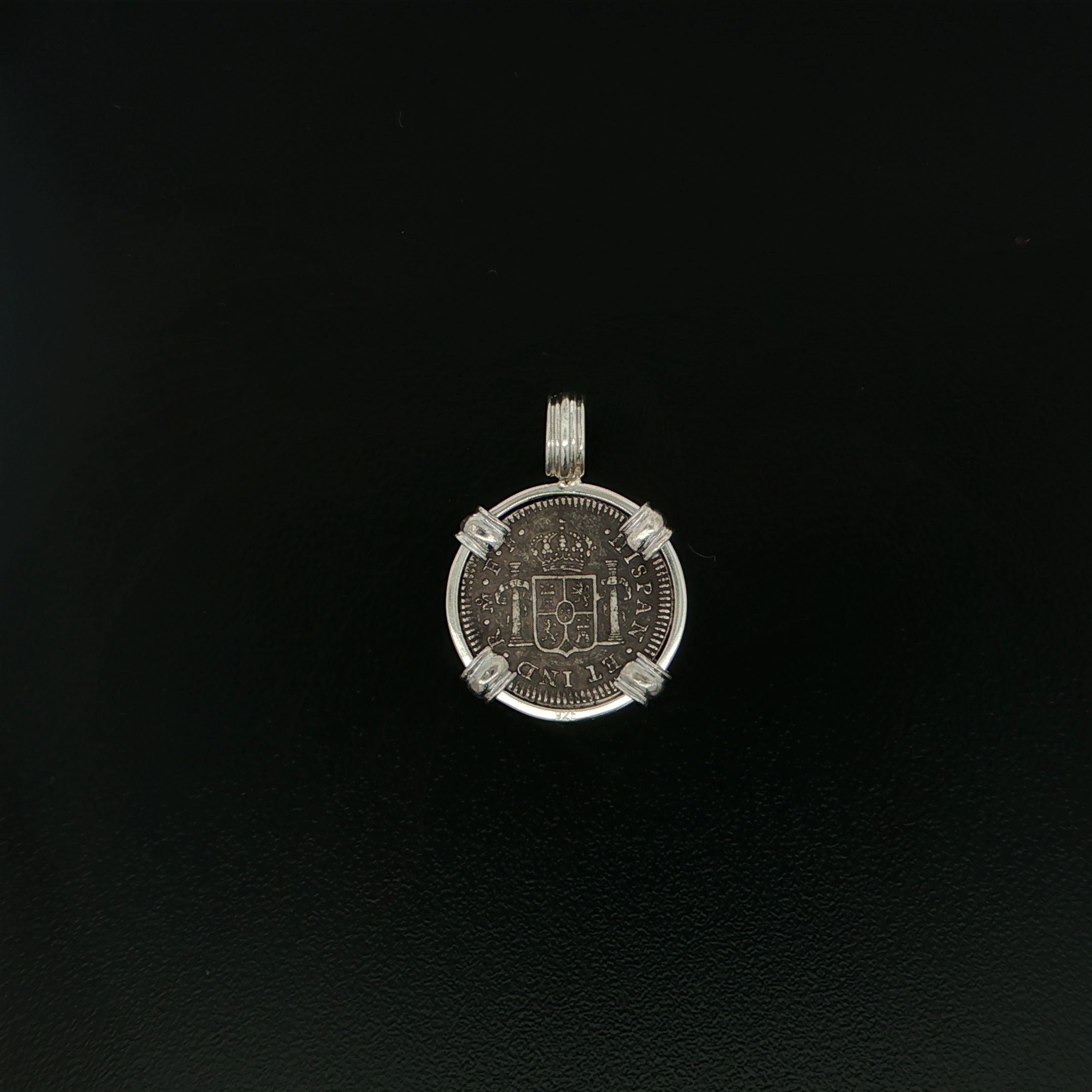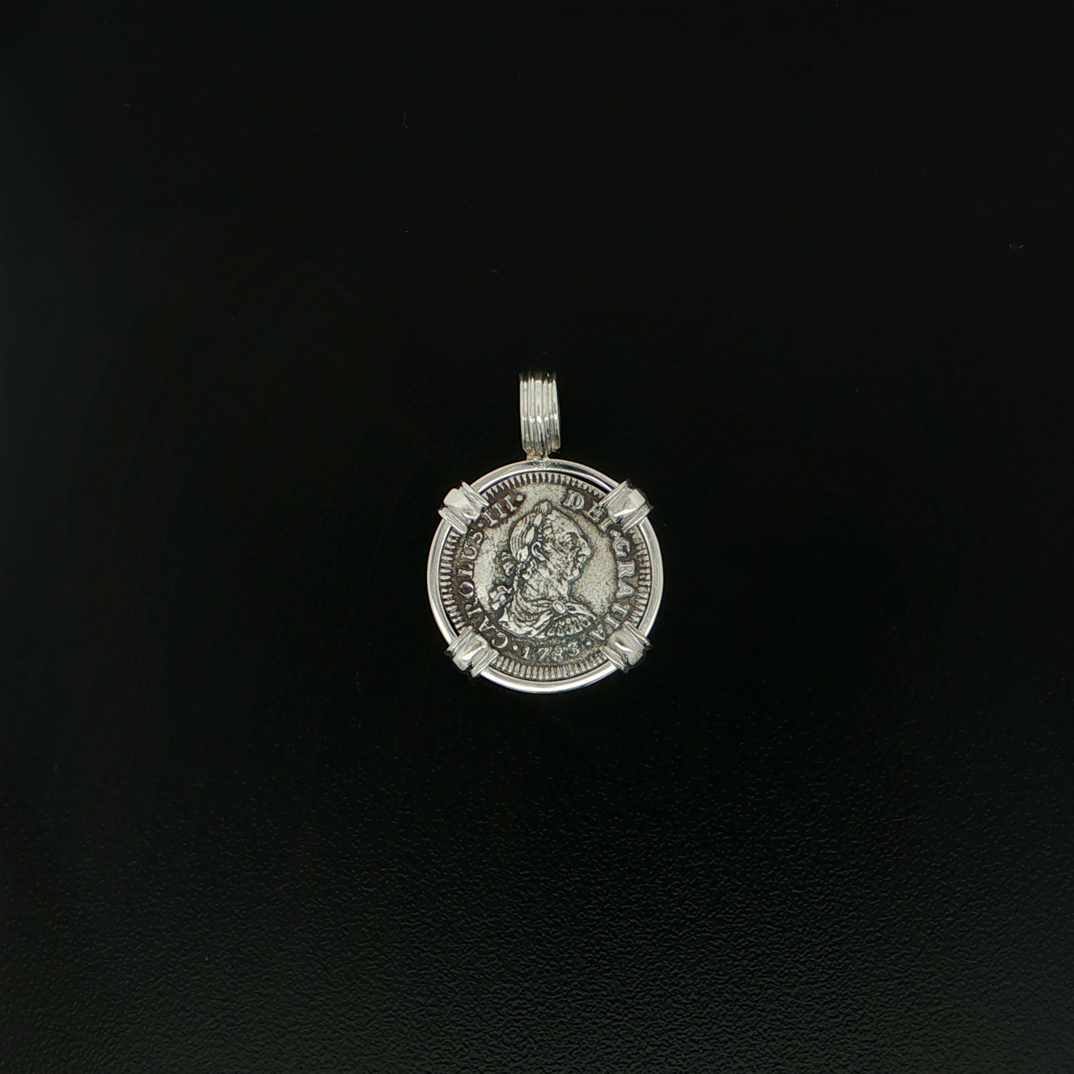 In 1783, the ill-fated ship, El Cazador, The Hunter was headed toward New Orleans from Vera Cruz, Mexico. The ship was laden with 450,000 pesos, which were intended to solidify Spain’s holdings of approximately one million square miles of America’s heartland, called the Louisiana Territory. The vessel and her crew disappeared without a trace, never arriving to help stabilize the economy. In 1803, Napoleon and President Thomas Jefferson struck a deal called the Louisiana Purchase. The U.S. purchased this land for three cents an acre. The U.S. doubled in size, taking on the familiar shape that defines it today. This may never have happened if not for the shipwreck that changed the world.  This silver one real coin is hand-set in a sterling silver pendant.