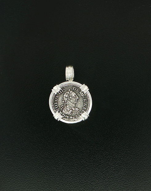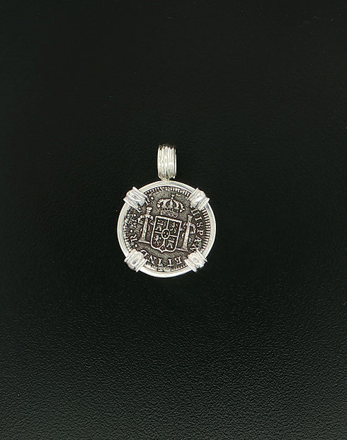 In 1783, the ill-fated ship, El Cazador, The Hunter was headed toward New Orleans from Vera Cruz, Mexico. The ship was laden with 450,000 pesos, which were intended to solidify Spain’s holdings of approximately one million square miles of America’s heartland, called the Louisiana Territory. The vessel and her crew disappeared without a trace, never arriving to help stabilize the economy. In 1803, Napoleon and President Thomas Jefferson struck a deal called the Louisiana Purchase. The U.S. purchased this land for three cents an acre. The U.S. doubled in size, taking on the familiar shape that defines it today. This may never have happened if not for the shipwreck that changed the world.  This silver one real coin is hand-set in a sterling silver pendant.