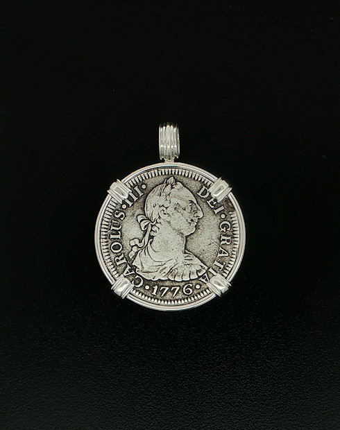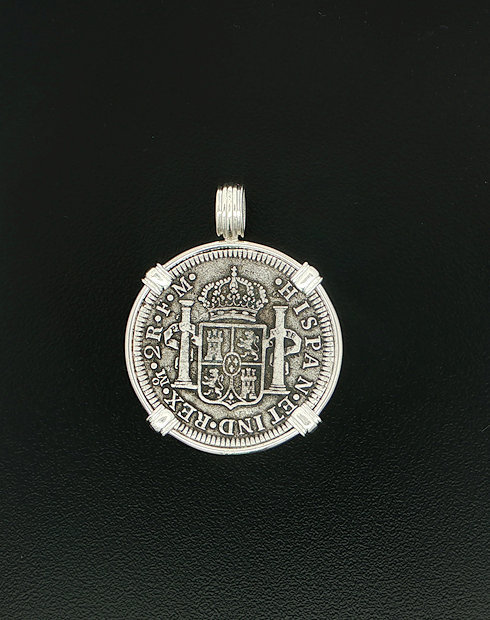 In 1783, the ill-fated ship, El Cazador, The Hunter was headed toward New Orleans from Vera Cruz, Mexico. The ship was laden with 450,000 pesos, which were intended to solidify Spain’s holdings of approximately one million square miles of America’s heartland, called the Louisiana Territory. The vessel and her crew disappeared without a trace, never arriving to help stabilize the economy. In 1803, Napoleon and President Thomas Jefferson struck a deal called the Louisiana Purchase. The U.S. purchased this land for three cents an acre. The U.S. doubled in size, taking on the familiar shape that defines it today. This may never have happened if not for the shipwreck that changed the world.  This silver one real coin is hand-set in a sterling silver pendant.