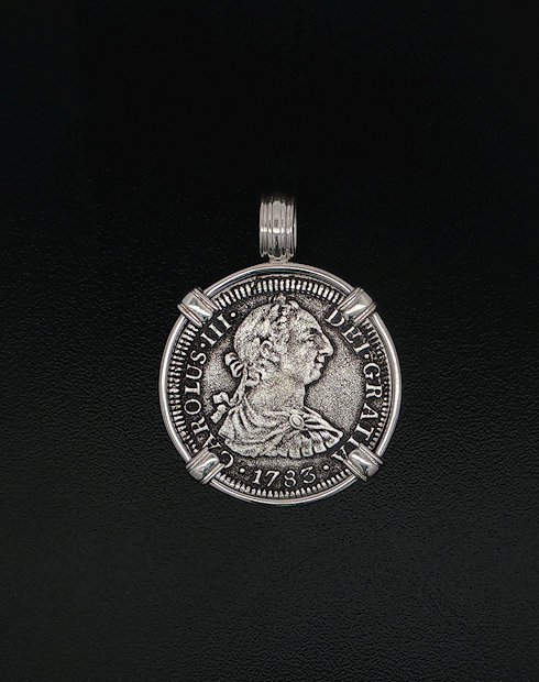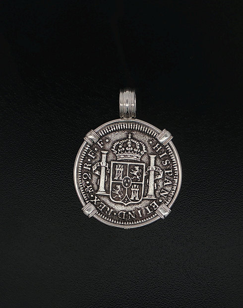 In 1784, the ill-fated ship, El Cazador, The Hunter was headed toward New Orleans from Vera Cruz, Mexico. The ship was laden with 450,000 pesos, which were intended to solidify Spain’s holdings of approximately one million square miles of America’s heartland, called the Louisiana Territory. The vessel and her crew disappeared without a trace, never arriving to help stabilize the economy. In 1803, Napoleon and President Thomas Jefferson struck a deal called the Louisiana Purchase. The U.S. purchased this land for three cents an acre. The U.S. doubled in size, taking on the familiar shape that defines it today. This may never have happened if not for the shipwreck that changed the world. This silver half real coin is hand-set in a sterling silver pendant.