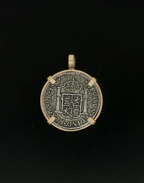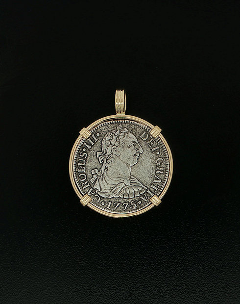 In 1784, the ill-fated ship, El Cazador, The Hunter was headed toward New Orleans from Vera Cruz, Mexico. The ship was laden with 450,000 pesos, which were intended to solidify Spain’s holdings of approximately one million square miles of America’s heartland, called the Louisiana Territory. The vessel and her crew disappeared without a trace, never arriving to help stabilize the economy. In 1803, Napoleon and President Thomas Jefferson struck a deal called the Louisiana Purchase. The U.S. purchased this land for three cents an acre. The U.S. doubled in size, taking on the familiar shape that defines it today. This may never have happened if not for the shipwreck that changed the world. This silver half real coin is hand-set in a 14kt gold pendant.