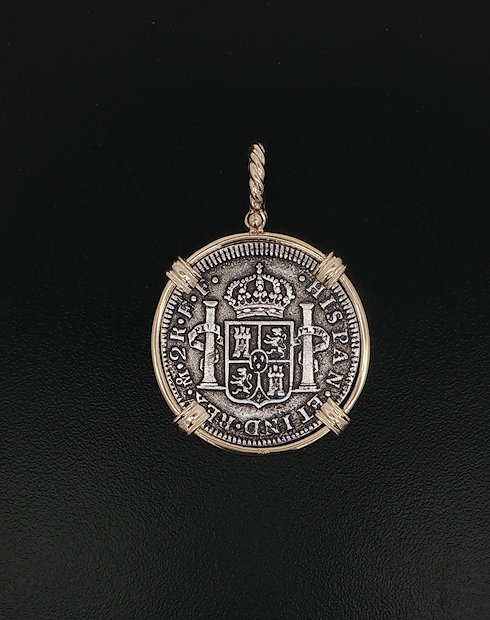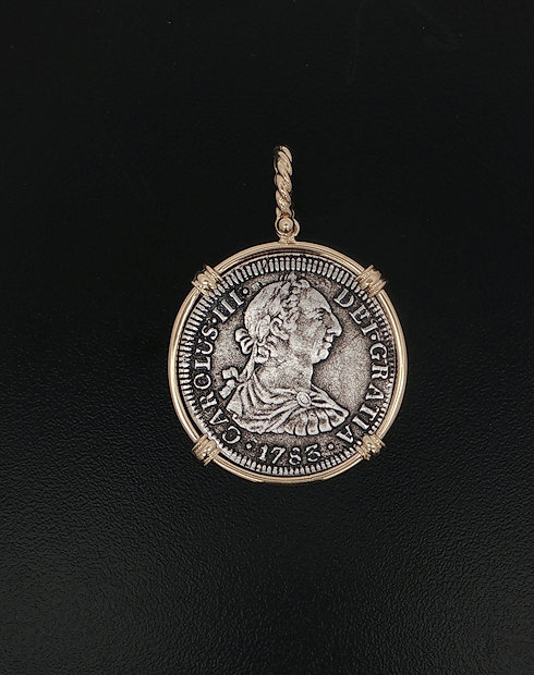 In 1784, the ill-fated ship, El Cazador, The Hunter was headed toward New Orleans from Vera Cruz, Mexico. The ship was laden with 450,000 pesos, which were intended to solidify Spain’s holdings of approximately one million square miles of America’s heartland, called the Louisiana Territory. The vessel and her crew disappeared without a trace, never arriving to help stabilize the economy. In 1803, Napoleon and President Thomas Jefferson struck a deal called the Louisiana Purchase. The U.S. purchased this land for three cents an acre. The U.S. doubled in size, taking on the familiar shape that defines it today. This may never have happened if not for the shipwreck that changed the world. This silver half real coin is hand-set in a 14kt gold pendant.