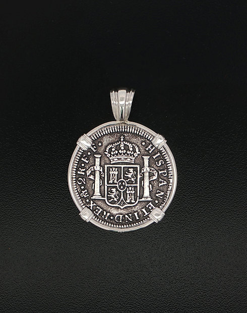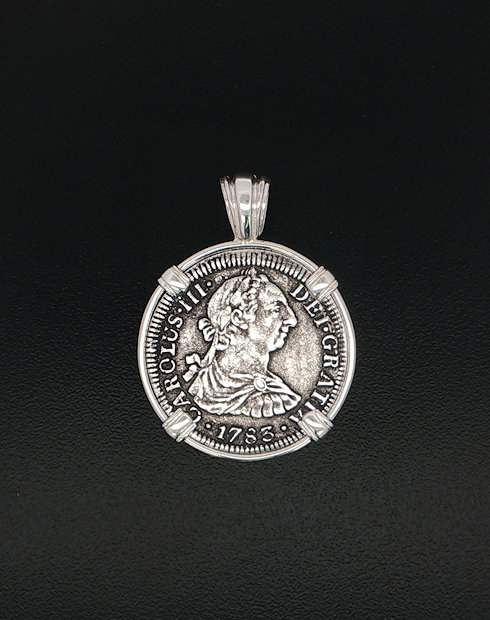 In 1784, the ill-fated ship, El Cazador, The Hunter was headed toward New Orleans from Vera Cruz, Mexico. The ship was laden with 450,000 pesos, which were intended to solidify Spain’s holdings of approximately one million square miles of America’s heartland, called the Louisiana Territory. The vessel and her crew disappeared without a trace, never arriving to help stabilize the economy. In 1803, Napoleon and President Thomas Jefferson struck a deal called the Louisiana Purchase. The U.S. purchased this land for three cents an acre. The U.S. doubled in size, taking on the familiar shape that defines it today. This may never have happened if not for the shipwreck that changed the world. This silver half real coin is hand-set in a sterling silver pendant.