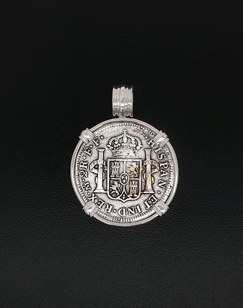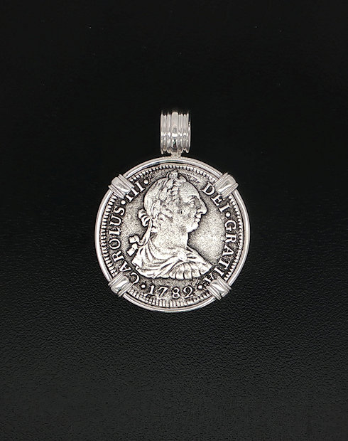 In 1784, the ill-fated ship, El Cazador, The Hunter was headed toward New Orleans from Vera Cruz, Mexico. The ship was laden with 450,000 pesos, which were intended to solidify Spain’s holdings of approximately one million square miles of America’s heartland, called the Louisiana Territory. The vessel and her crew disappeared without a trace, never arriving to help stabilize the economy. In 1803, Napoleon and President Thomas Jefferson struck a deal called the Louisiana Purchase. The U.S. purchased this land for three cents an acre. The U.S. doubled in size, taking on the familiar shape that defines it today. This may never have happened if not for the shipwreck that changed the world. This silver half real coin is hand-set in a sterling silver pendant.