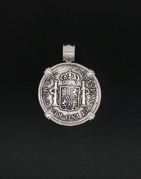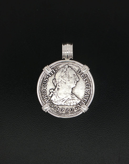 In 1784, the ill-fated ship, El Cazador, The Hunter was headed toward New Orleans from Vera Cruz, Mexico. The ship was laden with 450,000 pesos, which were intended to solidify Spain’s holdings of approximately one million square miles of America’s heartland, called the Louisiana Territory. The vessel and her crew disappeared without a trace, never arriving to help stabilize the economy. In 1803, Napoleon and President Thomas Jefferson struck a deal called the Louisiana Purchase. The U.S. purchased this land for three cents an acre. The U.S. doubled in size, taking on the familiar shape that defines it today. This may never have happened if not for the shipwreck that changed the world. This silver half real coin is hand-set in a sterling silver pendant.