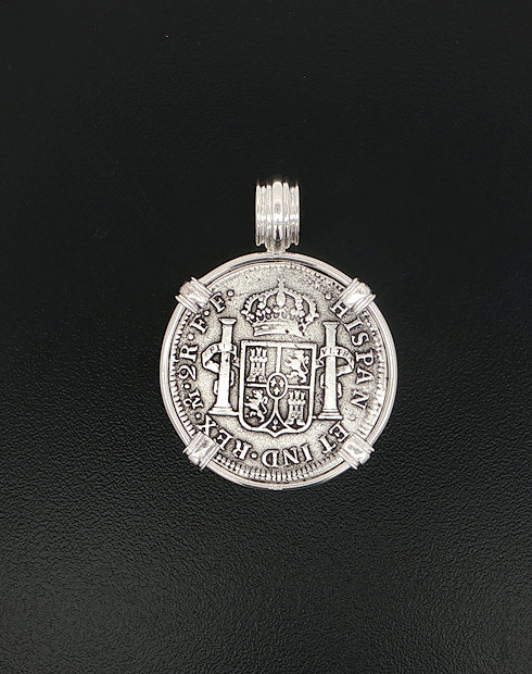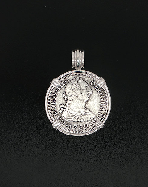 In 1784, the ill-fated ship, El Cazador, The Hunter was headed toward New Orleans from Vera Cruz, Mexico. The ship was laden with 450,000 pesos, which were intended to solidify Spain’s holdings of approximately one million square miles of America’s heartland, called the Louisiana Territory. The vessel and her crew disappeared without a trace, never arriving to help stabilize the economy. In 1803, Napoleon and President Thomas Jefferson struck a deal called the Louisiana Purchase. The U.S. purchased this land for three cents an acre. The U.S. doubled in size, taking on the familiar shape that defines it today. This may never have happened if not for the shipwreck that changed the world. This silver half real coin is hand-set in a sterling silver pendant.