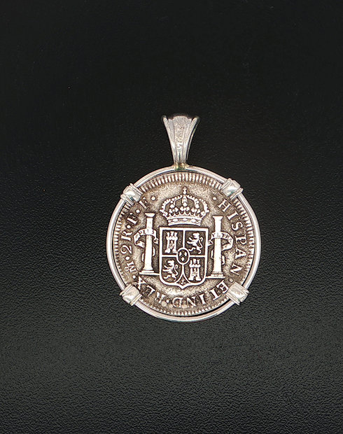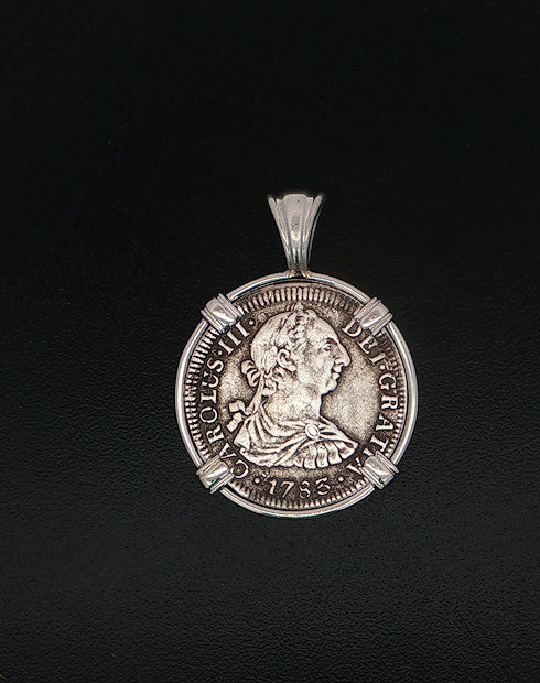 In 1784, the ill-fated ship, El Cazador, The Hunter was headed toward New Orleans from Vera Cruz, Mexico. The ship was laden with 450,000 pesos, which were intended to solidify Spain’s holdings of approximately one million square miles of America’s heartland, called the Louisiana Territory. The vessel and her crew disappeared without a trace, never arriving to help stabilize the economy. In 1803, Napoleon and President Thomas Jefferson struck a deal called the Louisiana Purchase. The U.S. purchased this land for three cents an acre. The U.S. doubled in size, taking on the familiar shape that defines it today. This may never have happened if not for the shipwreck that changed the world. This silver half real coin is hand-set in a sterling silver pendant.